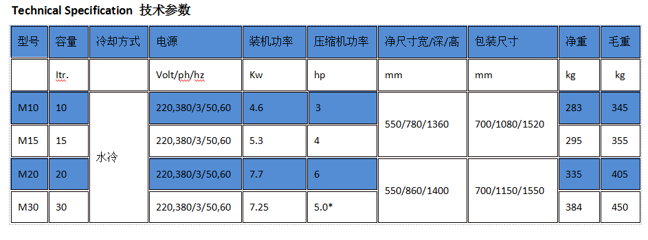 1:“工作能力”参数是指在环境空气温度25摄氏度或冷却水温20摄氏度条件下测试的。每批处理时间和每小时工作能力可能由于原料品种和冷却条件不同而产生差异。