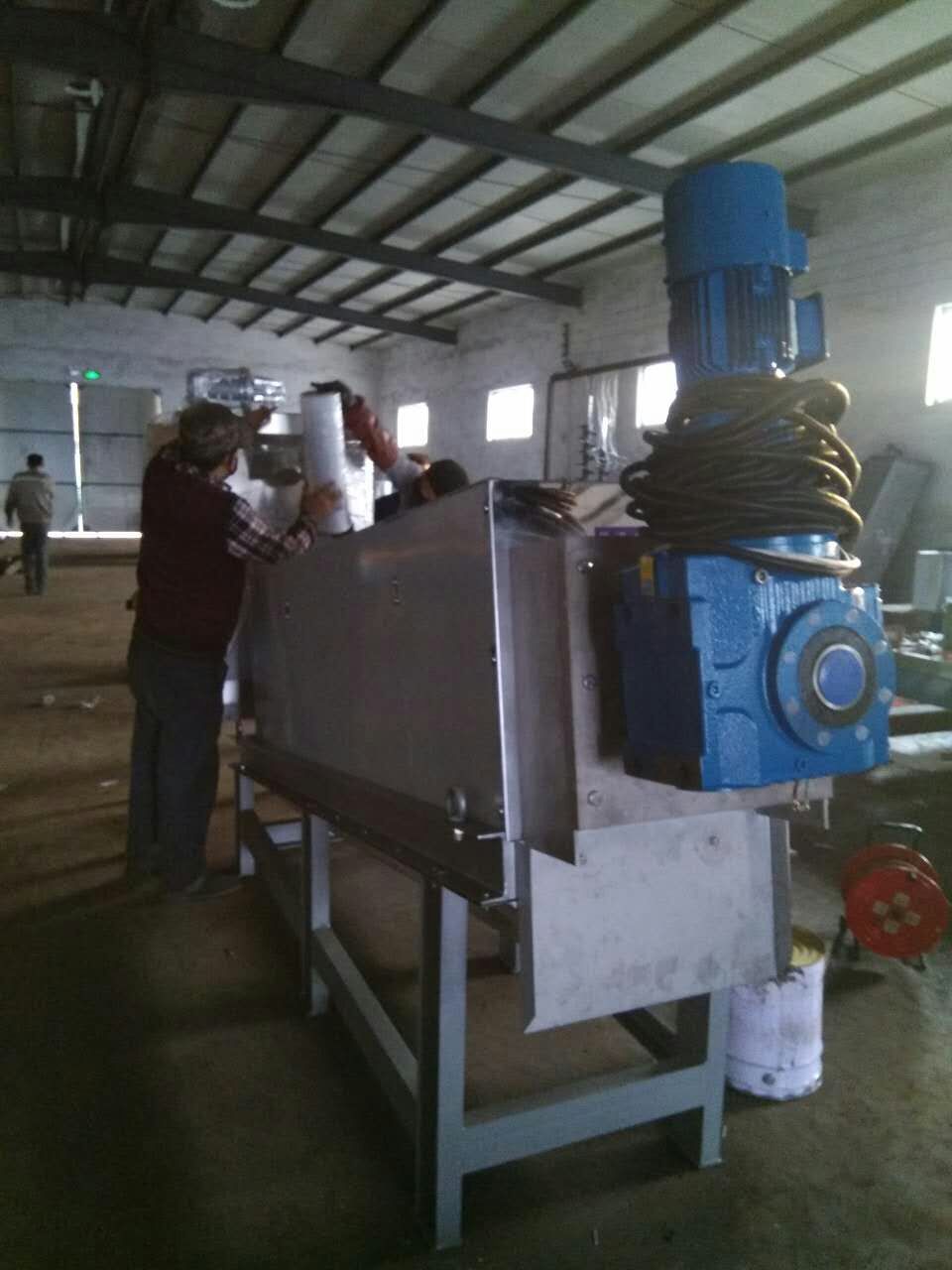 污泥在浓缩部经过重力浓缩后,被运输到脱水部,在前进的过程中随着滤缝及螺距的逐渐变小,以及背压板的阻挡作用下,产生极大的内压,容积不断缩小,达到充分脱水的目的。