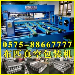 本包装机是为卷圆布匹之自动包装而设计。置放于进布输送带上的布匹先被PE膜三面封口袋