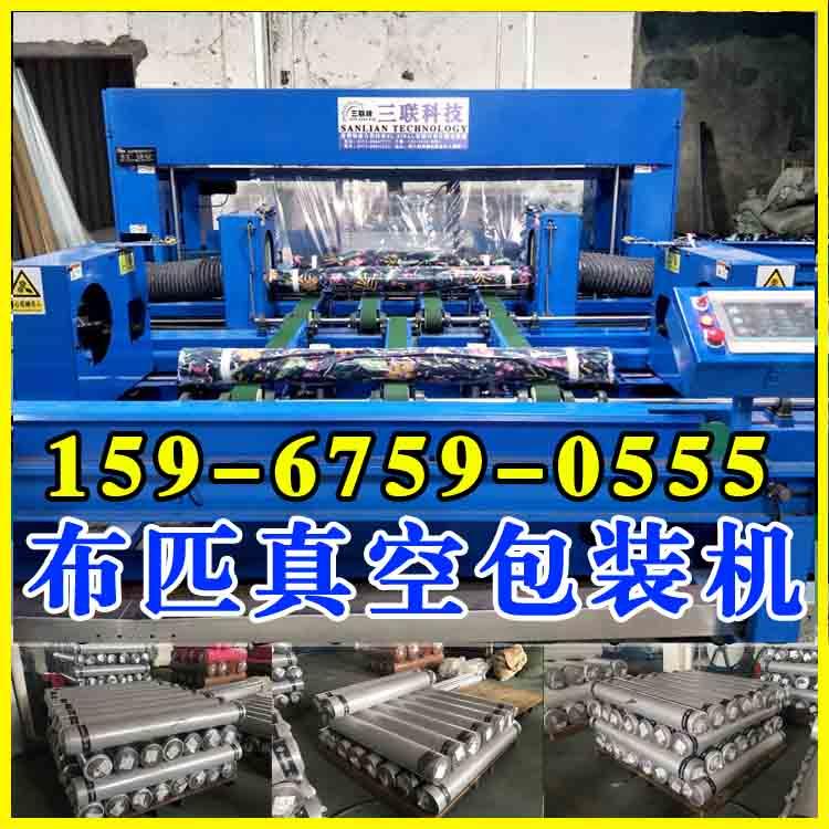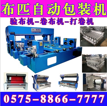 本包装机是为卷圆布匹之自动包装而设计。置放于进布输送带上的布匹先被PE膜三面封口袋