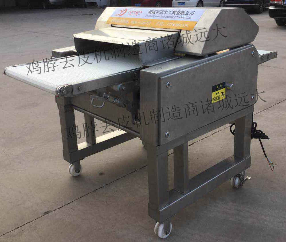 YD-2000全自动鸡脖剥皮机,采用德国先进技术,整机采用优质不锈钢和耐腐蚀高强度合金钢制造,核心部件国外进口,产品性能优越,坚固耐用。设备自带前后传送装置,去皮厚度可随意调节,易操作,清理方便,是目前国内外肉类加工行业中应用最广泛的设备之一。