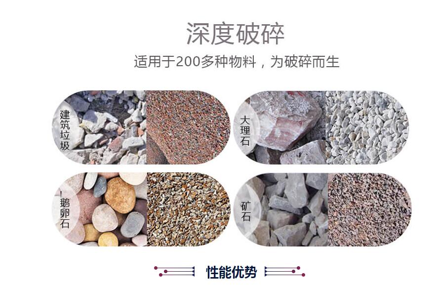 移动鹅卵石破碎方式为曲动挤压型。工作时,电动机驱动皮带和皮带轮,通过偏心轴使动颚上下运动,当动颚上升时,肘板和动颚间夹角变大,从而推动动颚板向定颚板接近,物料通过两颚板之间的挤压、搓、碾等实现多重破碎;当动颚下行时,肘板和动颚间夹角变小,动颚板在拉杆、弹簧的作用下离开定颚板,已破碎物料在重力的作用下,经颚腔下部的出料口自由卸出。随着电动机的连续转动,动颚做周期性的压碎和排料,实现批量生产。利用冲击能来破碎物料。当物料进入板锤作用区时,受到板锤的高速冲击而破碎,并被抛向安装在转子上方的反击装置上再次破碎,然后又从反击衬板上弹回到板锤作用区重新破碎。此过程重复进行,直到物料被破碎至所需粒度,由机器下部排出为止。调整反击架与转子架之间的间隙可达到改变物料粒度和物料形状的目的。使生成组织、物流转运更加直接有效
