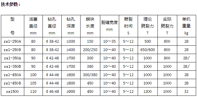 润滑:使用前将中间楔块伸出,在受力表面及外楔块内槽内,涂抹专用润滑脂,每使用5-10次,在外楔块表面涂抹一次润滑脂,充分减少摩擦,增大实际分裂力,延长使用寿命。