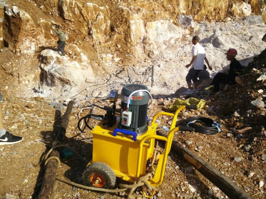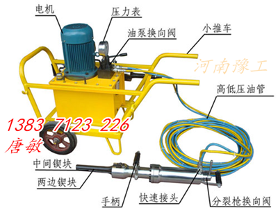 液压劈裂机的原理是采用电动机带动超高压动力站,产生的高压液压油通过油管把动力传输到液压劈裂枪,液压劈裂枪可以通过我们的控制阀来控制伸缩,产生涨裂的目的。