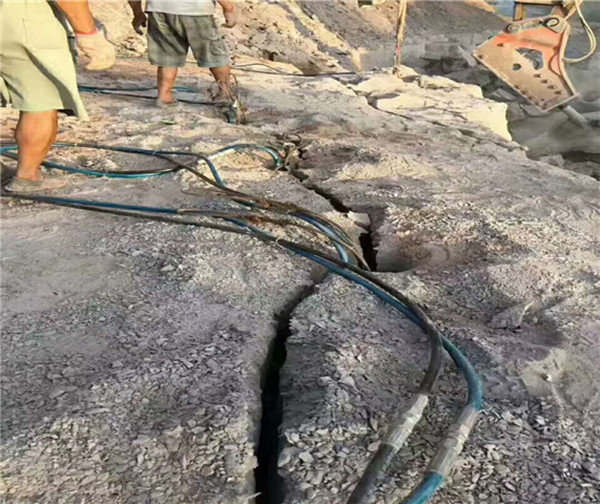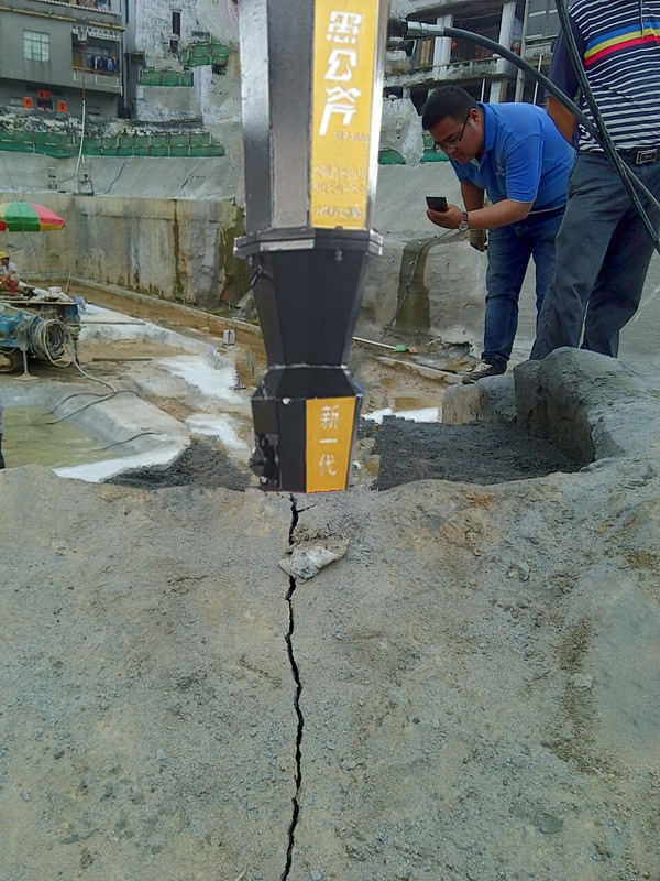 岩石劈裂机于不能作业并要求产量高、工期紧等难度大土石方工程。岩石劈裂机钻孔直已达到110厘米,钻孔间隔3到5米一排,挖机装放入岩石孔中,两分钟左右可胀裂开石头50立方左右,破碎坚石上千立方,比使锤+切割机或膨碎剂快2倍以上,且成本低。 无震动、无冲击、无噪音、无粉尘数秒钟内可完成,工作效率高可控、拆除非,尺寸重量适中、操作简单、方便可在室内和狭窄场地进行拆除工作,此机在静态液压下可控制性的工作,不会像机和其它冲击性拆除、凿岩设备那样,产生一些危险隐患;采取复杂的措施。工作时做高频往复运动,不断地冲击钎尾。在冲击力的作用下,呈尖楔状的钎头将岩石压碎并凿入一定的深度,形成一道凹痕。退回后,钎子转过一定角度,向前运动,再次冲击钎尾时,又形成一道新的凹痕。两道凹痕之间的扇形岩块被由钎头上产生的水平分力剪碎。 机器数秒钟可完成过程,并且可连续无间断地工作,效率高,运行及保养成本很低,作业那样采取隔离或其它耗时和的措施。.愚公斧劈裂机器与大多数的拆除方法和设备不同,该机可以预先的方向,形状以及需要的部分尺寸,高。
