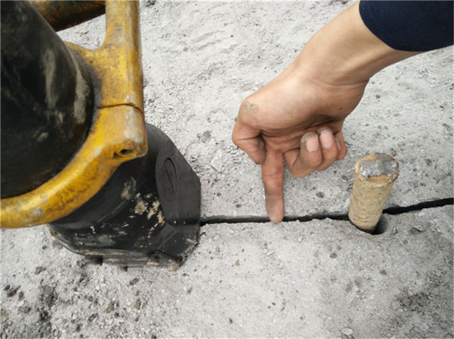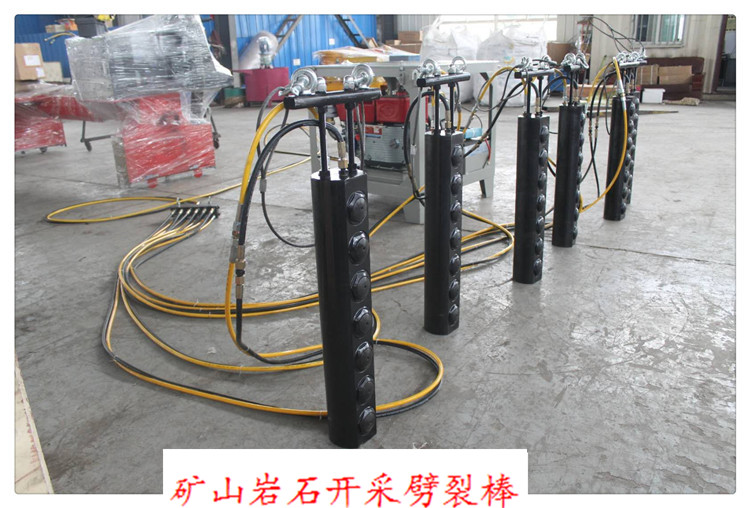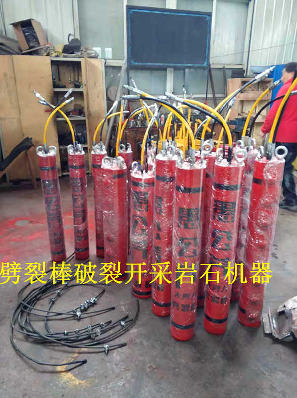 液压劈裂机作业原理为:使风稿(液压稿),凿钻圆孔上,刺进劈裂机楔形块组件,当启动液压泵,液压泵作业发生高压,驱动劈裂机楔形块组中心楔块向前运动,将反向楔块两头撑开,发生力(达600~900吨)。此力由岩石内部向外,损坏岩石内部结构,(此力是拉力,需知:岩石拉力远远小于抗压力,只要其抗压力10%左右);岩石在此力效果下,沿设定方位依据人们需要开来。产品说明:液压劈裂棒是由一条缸,11个,多个密封件,多根高压管几大部件组成。分为一根进管,一根回管。进时液压破石棒会伸,这就是一个工作,也就是岩石破裂时间。它动力源是由液压动力通过管传输液压,可达到120mp,理论力1200t.单根30kg,一个动力可高6根。