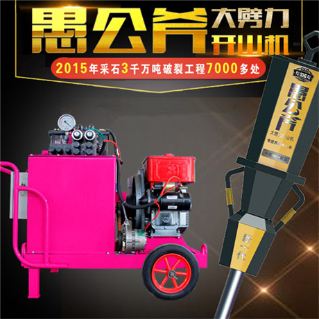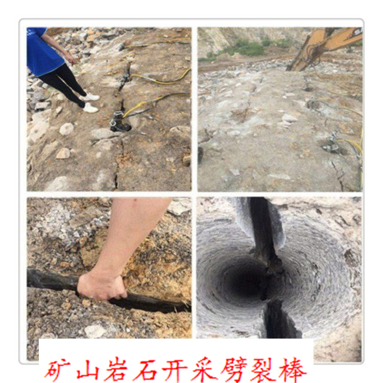 石头破裂大机载式劈裂机工作原理:岩石劈裂机于不能作业并要求产量高、工期紧等难度大土石方工程。岩石劈裂机钻孔直已达到110厘米,钻孔间隔3到5米一排,挖机装放入岩石孔中,两分钟左右可胀裂开石头50立方左右,破碎坚石上千立方,比使锤+切割机或膨碎剂快2倍以上,且成本低。无震动、无冲击、无噪音、无粉尘数秒钟内可完成,工作效率高可控、拆除非,尺寸重量适中、操作简单、方便可在室内和狭窄场地进行拆除工作,此机在静态液压下可控制性的工作,不会像机和其它冲击性拆除、凿岩设备那样,产生一些危险隐患;采取复杂的措施。工作时做高频往复运动,不断地冲击钎尾。在冲击力的作用下,呈尖楔状的钎头将岩石压碎并凿入一定的深度,形成一道凹痕。退回后,钎子转过一定角度,向前运动,再次冲击钎尾时,又形成一道新的凹痕。两道凹痕之间的扇形岩块被由钎头上产生的水平分力剪碎。机器数秒钟可完成过程,并且可连续无间断地工作,效率高,运行及保养成本很低,作业那样采取隔离或其它耗时和的措施。.愚公斧劈裂机器与大多数的拆除方法和设备不同,该机可以预先的方向,形状以及需要的部分尺寸,高。