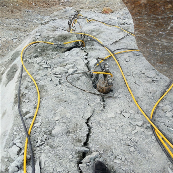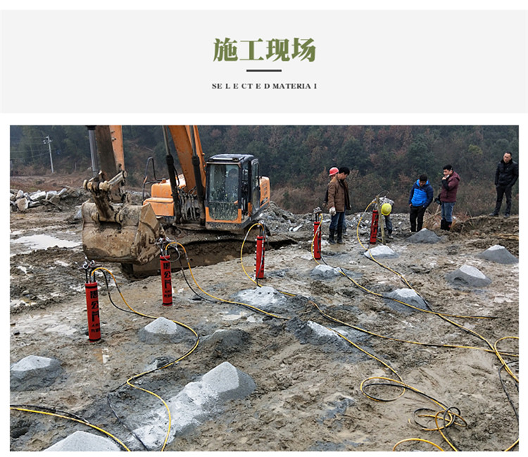 劈裂机采用挖机吊装放入孔中,液压动力使尖迅速产生5000吨的的工作压力,一次就可胀裂开石头10-20立方左右。