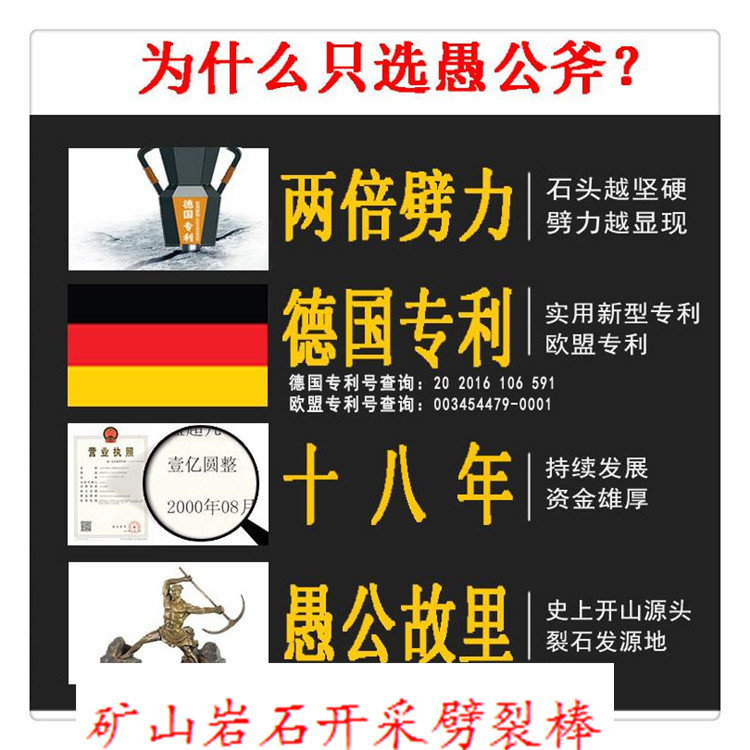 愚公斧液压劈裂机工作时,不会产生震动、冲击、噪音、粉尘飞屑等,周围不会受到影响。即使在人口稠密地区或室内,以及紧密设备旁,都可以无地进行工作。如:旧屋拆除、混凝土拆除、桩头拆除、旧基础拆除。选大品牌的劈裂棒厂家,更有保障。多客户在我们公司开山机或机时都的产品跟我们进行比较,可能是相差不多的外形给大家造成了误解。开山机、劈裂机这类产品在之前没有多大的市场,大家也只是闻其名,并未对其真正的了解过。