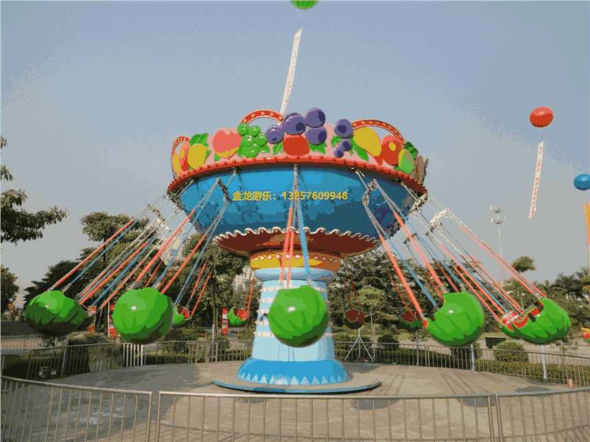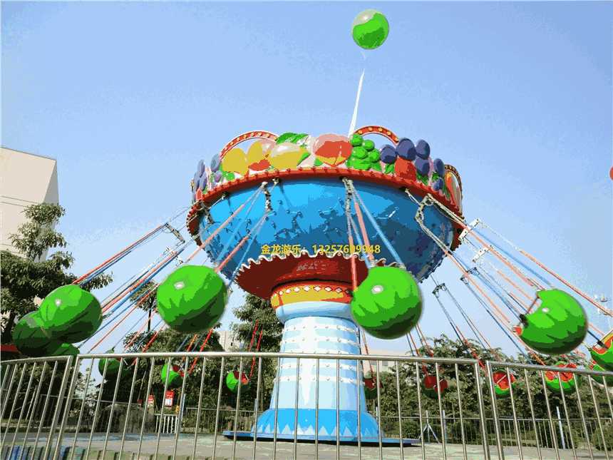 金龙水果飞椅是以西瓜的造型作为飞椅外壳,有色泽亮丽的玻璃钢制成,外观靓丽而可爱,随着机器的旋转,飞椅在空中飘荡起来,及刺激有好玩。