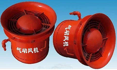 由井下压气管道中引出的压气通过胶管与气动风机外壳上的气动马达进气口联接后,开启阀门,压气驱动马达转动带动风叶轮旋转,叶轮对空气做功,使空气具有能量后以一定的速度排出风机,由风筒引导到需要的地方。