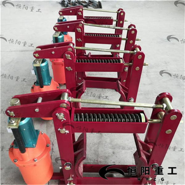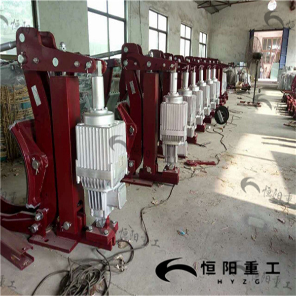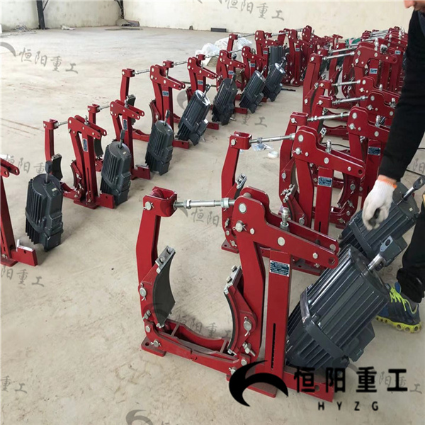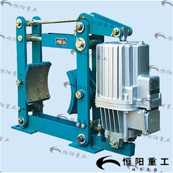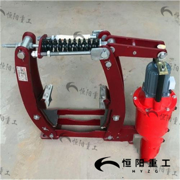 外抱块式制动器:它按操纵装置行程的长短又分为短行程块式制动器和长行程块式制动器.短行程块式制动器的磁铁直接装在制动臂上。工作时,动铁芯绕销轴转动实现松闸;磁铁断电时靠主弹簧紧闸。这种制动器结构紧凑,紧闸和松闸动作快,但冲击力大。长行程块式制动器可以通过制动杠杆系统产生大的松闸力,但制动动作慢,适于大型制动器。YWZ4-100/18电力液压制动器 可定制 包安装