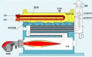 真空热水锅炉的结构见图,是由燃烧室、水管、负压蒸汽室、热交换器、热媒介水等组成的。炉体内部为真空状态,与外部空气隔绝,形成密闭状态。热媒水覆盖着炉膛和水管并密闭在炉体内部因负压蒸汽室内的压力保持在大气压之下,当密闭在内的热媒水在燃烧加热后,立即就沸腾起来,产生与热媒水相同温度的蒸汽。炉内产生的蒸汽在上升过程中,接触到配置在负压蒸汽室内的热交换器表面,由于热交换器内的水温低于蒸汽温度,蒸汽会在热交换器表面上冷凝并放出大量汽化热,加热热交换器中的水或其它介质,冷凝水在重力作用下重又回到热媒水中。因此,热媒水不断在封闭的炉体内进行着"沸腾=蒸发=冷凝=热媒水"的循环。无须补充冷凝水,也无空烧的危险。热交换器中的水(介质)被加热后输送给用户用于空调和卫生热水或其它用途。