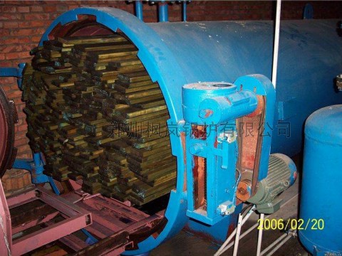 工作原理和性能:机组采用真空、加压、加热等一系列工艺操作将木材的树脂脱掉,并把调制成一定浓度的防腐、阻燃、染色、药液经过高压注入木材细胞内部,从而起到防腐、防霉、防蛀、防白蚁等保护处理。