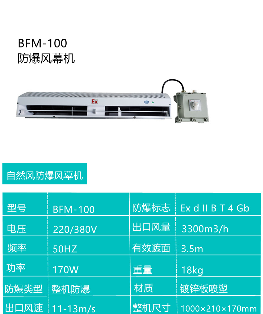 防爆风幕机安装在制冷、空调、防尘、隔热、化学车间、精车间、喷漆等容易发生爆燃的场所、起动该机,能把室内外的空气隔开,起到既出入方便,又能防止室内外冷热空气交换,同时,又具有防尘、防污染之功效。广泛用于电子、仪表、制药、食品、精密加工、化工、制鞋及服务、商业等等行业。
