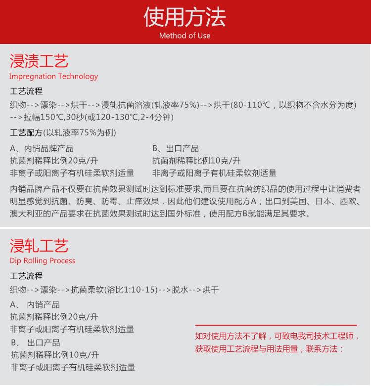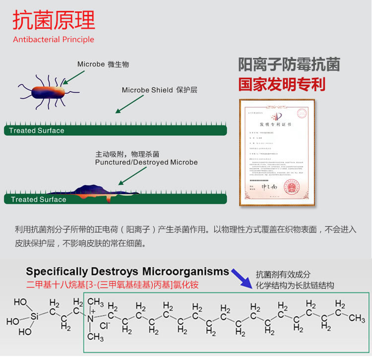 AEM5700适用于各种类型织物。可广泛的使用于多种生产方式中,能灵活结合相关工艺流程及生产条件下进行抗菌加工。其属于非释放型的处理剂,不渗失、不游移,也不为微生物所消耗,可赋予材料表面优越的耐久性。其采用特殊的机械式杀菌,不会出现抗药性,且可避免由细菌、藻类和酵母菌等引起的产品变质或变色等问题,并能防止异味产生,可反复的洗涤10-20次。
