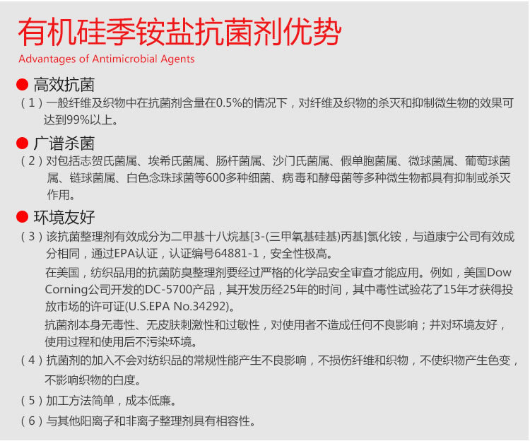 纺织抗菌剂AEM5700可对纺织物进行抗菌整理,可赋予纺织品对微生物独特的防护功能并具优越的耐久性,可以防止微生物所引起的危害,提升生活品质,提升产品的功能性。