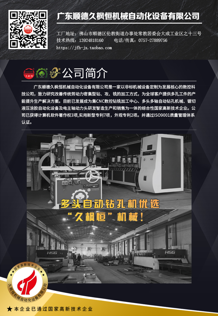 广东顺德久枫恒机械自动化设备有限公司是一家以非标机械设备定制为发展核心的数控科技公司,致力研究改善传统劳动力密集型钻、攻、铣的加工方式,为全球客户提供多孔工件的产能提升生产解决方案。目前已发展成为集CNC数控钻铣加工中心、多头多轴自动钻孔机械、锯切液压涂胶自动化设备及电主轴动力头研发智造生产和销售为一体的综合性国家高新技术企业。公司已获得计算机软件著作权3项,实用新型专利7项,外观专利2项。并通过ISO9001质量管理体系认证。