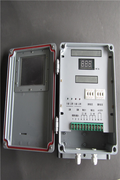本产品在工作过程中,刚接通电源时,延时10秒工作指示灯1和2均亮继电器不动作,延时之后通过两路光电传感器检测带速信号,然后输入控制箱内,经微电脑(CPU)显示并计算得出实际的带速送显示器,同时与预置带速进行比较,当带速低于设定值,控制器显示带速,并使相对应的继电器发出信号,同时对应的指示灯(红色)亮,说明皮带打滑;反之,当实际带速高于设定值时,控制器进入正常工作,对应指示灯(绿色)亮。继电器释放。两路输入,输出为相互独立工作。