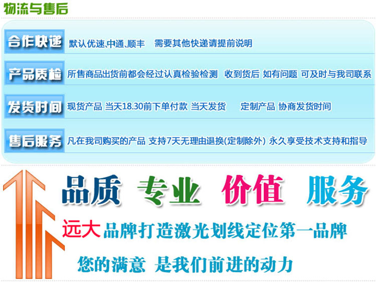 质量问题:本店提供七天包退,十五天包换,工业A、B保修三个月,精工级系列一年保修的服务,因为激光产品为工业级产品,一点点的胶水或者痕迹不视为质量问题,请大家理解。
