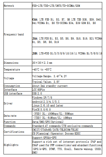 Support a rich set of internet protocols (PAP and CHAP used for PPP connections)and abundant functions (GPS/A-GPS, DTMF, TTS, Ecall, Remote wakeup, USSD, SMS) |