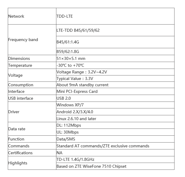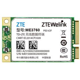 ME3760 V2F为标准的Mini PCI-E封装模块,支持TD-LTE 1.4GHz/1.8GHz专网频段。