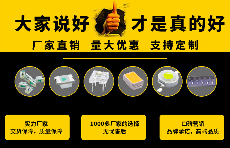 用途:广泛应用于照明,模组,背光源、交通灯、节能灯、汽车仪表、汽车尾灯、水底灯、草坪灯、埋地灯、护栏灯、彩灯、射灯、水晶灯、光电鼠标、验钞机,灯带,电子玩具、LED显示屏及LED手电筒等诸多生产领域。特点节能环保,使用寿命长。