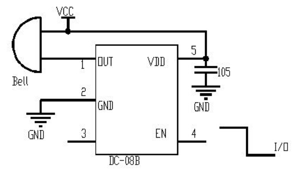 DC-08 是一款适用于 SMD 贴片式电磁式蜂鸣器的专用驱动芯片,采用 FUSE 修正技术,可以根据客户的要求提供 2.4K、2.7K、3.0K 等输出频率。产品具有工作电压范围宽、温度特性好、输出频率稳定等特点,采用 SOT23-5 封装,无需任何外部元件,EN 使能端直接与单片机接口,以满足客户便携式、小型化的使用要求。