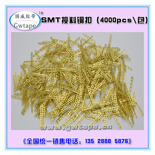 1、SMT接料铜扣纯铜制成,薄,质软,配合smt单面接料带与接料钳一同使用,接料牢固可靠,且容易剪切,不影响贴片机切刀与飞达工作