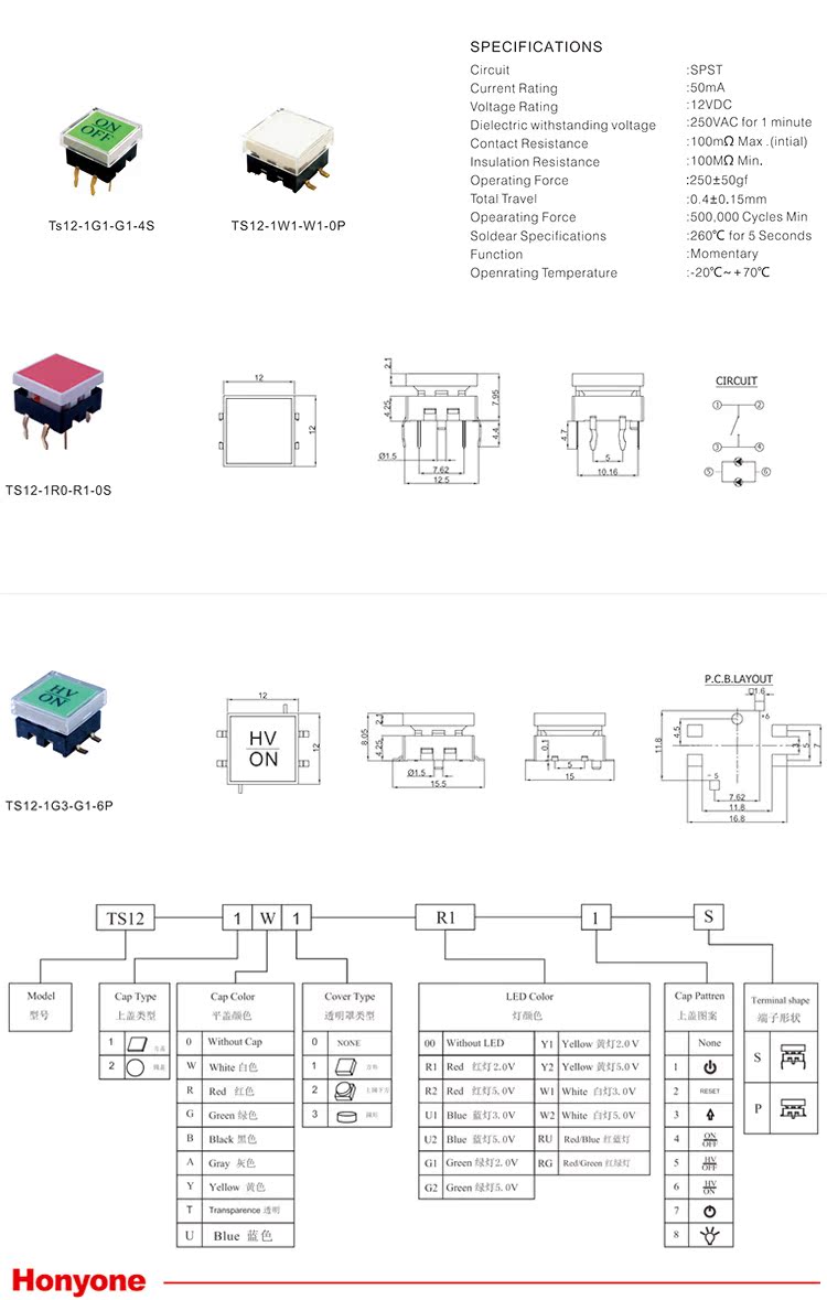 HONYONE TS12方形 带灯轻触开关