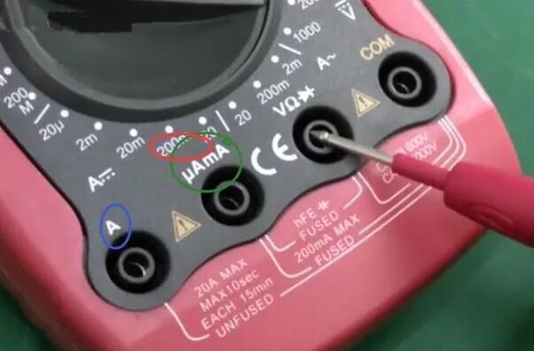 3、表笔插孔,而且要测量的这些功能必须由红表笔和黑表笔共同来完成。这在两孔下面用有接地符号的白色连线注明。接下来的第三、第四插孔都是结合黑表笔测量电流用的红表笔的插孔,第三插孔只能用来测量mA,μA级的电流,还要受到量程的限制,只能测量200mA以内的电流。如上图中红色圆圈内的标注。第四插孔是用来测量安培级电流的,测量的范围在20A以内。