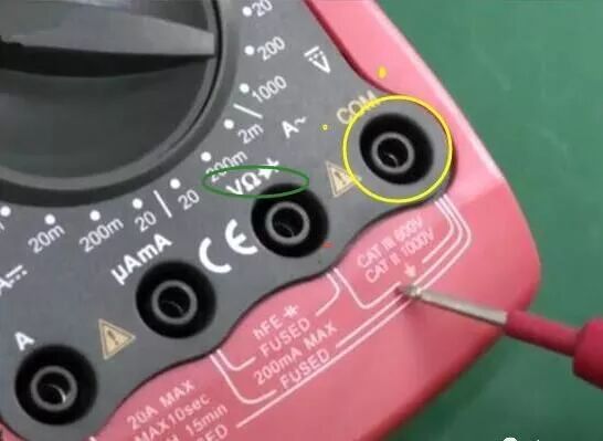 2、是黑表笔最常用插孔,一般测量电压、电流、电阻、二极管等黑表笔都插在这个插孔,也叫负表笔插孔。(上面图中黄色圆圈内的插孔。)右边的第二个插孔通过上面的绿色圆圈内标注可以看出是测量电压,电阻和二极管红。