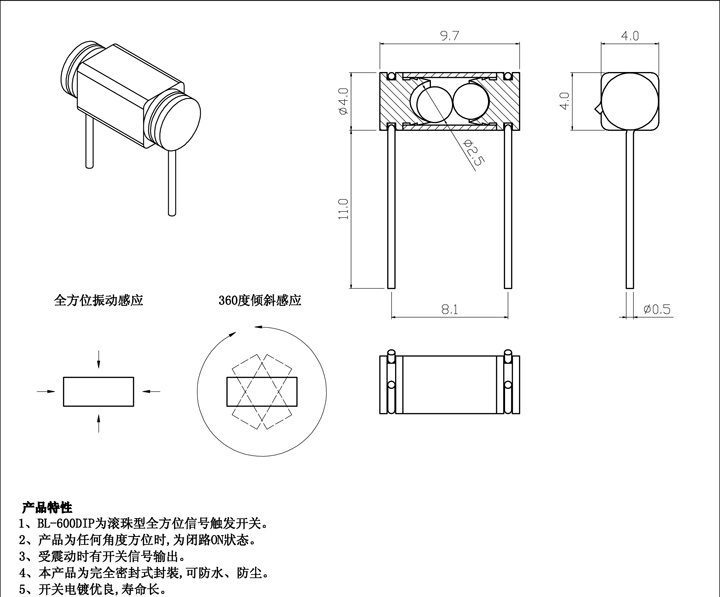 SW-600黄色滚珠型全方位信号触发开关 防尘 灵敏度标准