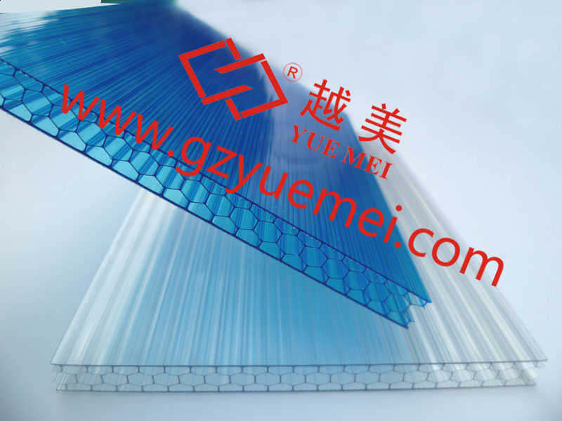越美牌PC蜂窝状中空板 这种多小孔的板材具有结构稳定、用料省、覆盖面广、强度高和结构轻巧等众多优点,具有六面柱体相互连接的蜂窝芯宛如无数个工字钢,芯层分布固定在整个板面内,使板块更加稳定,更抗弯挠和抗压,其抗风压大大超越于普通双层中空板