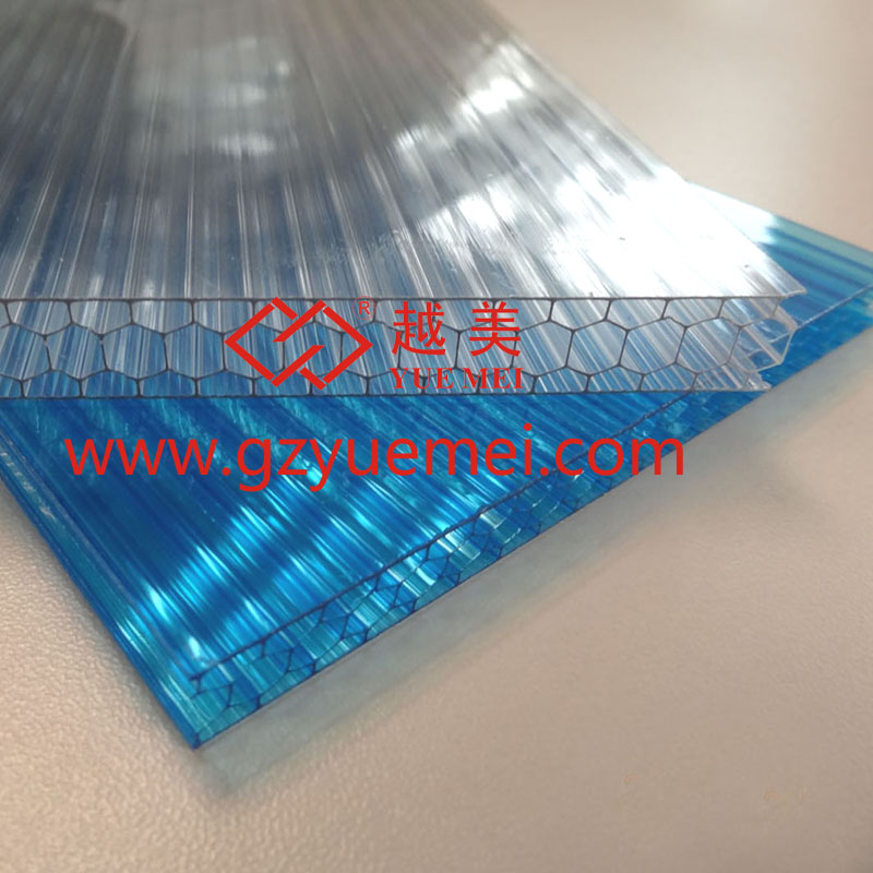 越美牌PC蜂窝状中空板 这种多小孔的板材具有结构稳定、用料省、覆盖面广、强度高和结构轻巧等众多优点,具有六面柱体相互连接的蜂窝芯宛如无数个工字钢,芯层分布固定在整个板面内,使板块更加稳定,更抗弯挠和抗压,其抗风压大大超越于普通双层中空板