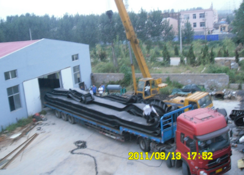 青岛川泽翔大倾角波状挡边带由基带、挡边、横隔板3部分组成。挡边起防止物料测滑撒落的作用。为便于绕过滚筒,挡边设计成波纹状;横隔板的作用是承托物料,为了实现大倾角输送,采用T型TC型。档边和横隔板是用二次硫化的方法与基带连接的,具有很高的连接强度