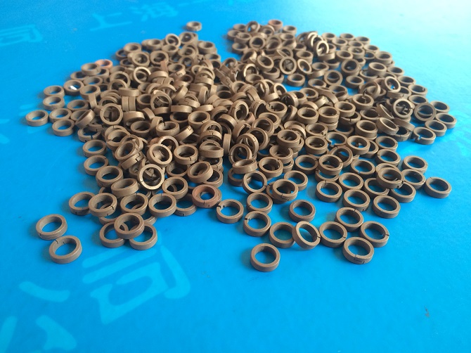 四氟活塞环、支撑环的材料配比大多为:F4:青铜粉:玻璃纤维:石墨:=100:40:20:10,他区别于金属环主要特点为:材料膨胀系数大,故应合理考虑热膨胀间隙,一般情况下较金属环大:材料强度低,所以活塞环截面较金属环要打:材料摩擦系数小,材料较软,相对耐磨性能插,应尽量减小比压;材料刚性小,活塞环在气体背压作用下易与气缸镜面贴合。密封效果好,活塞环数可相应减小;材料导热性低于金属,设计使用中也应引起足够的重视。