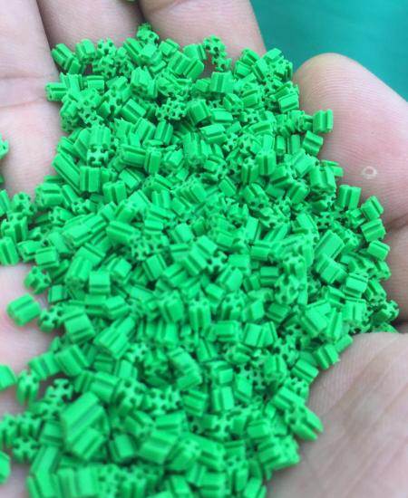 目前TPE环保颗粒大小为3mm左右,十字型颗粒,颜色、形状均可定制,每平方50mm人造草填充量为4-4.5kg左右,该环保颗粒无刺激性气味、无粉尘、表面光滑,是人造草坪理想的填充颗粒。