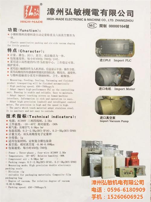 漳州弘敏机电有限公司生产的包装机适用于颗粒物料如种子、杂粮、面粉、大米、瓜子、小食品、味精、鸡精、白糖、食盐等。提供的包装机械如杂粮真空包装机、大米真空包装机、半自动大米真空包装机,颗粒真空包装机。
