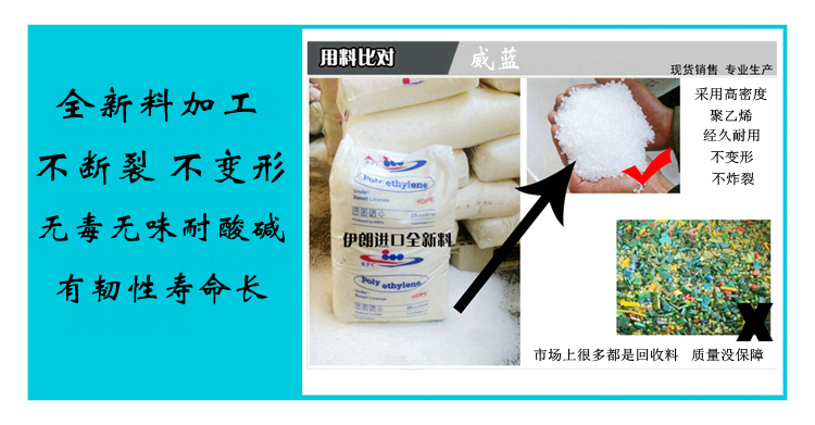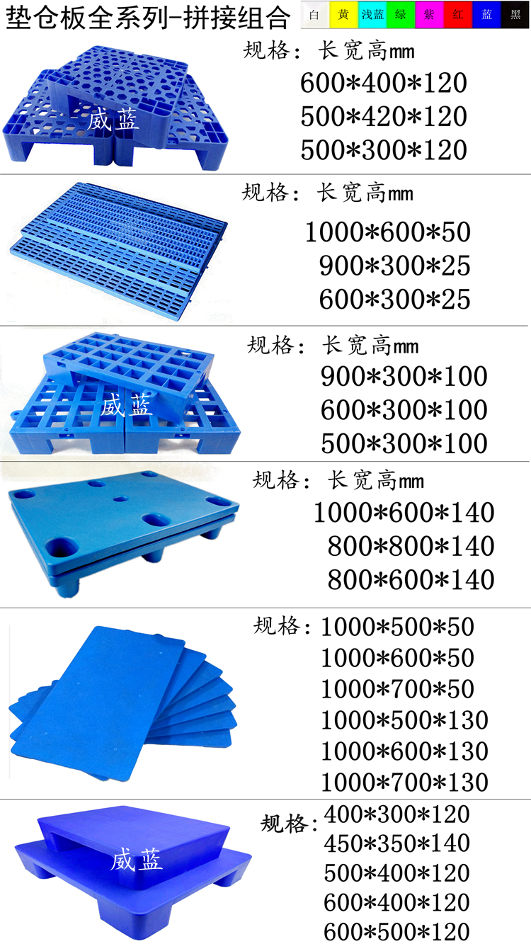 武汉威蓝塑业有限公司是从事塑料托盘(栈板地台板或垫仓板卡板)缠绕膜塑料周转箱零件盒垃圾桶生产的专业厂家!本公司主要产品有百余种塑料托盘(栈板地台板或垫仓板卡板)、塑料垃圾桶(箱)、塑料周转箱、零件盒,面条箱,塑料整理箱,水箱,周转筐,水桶,弹盖垃圾桶,保温箱,超市篮、平盘,静音手推车,方盘可倒置周转箱,仪表箱,海鲜盘,网眼箱,冷冻盘,榨水车等等塑料制品!本产品经济耐用,无钉无刺、无毒无味、耐酸碱防霉变!本公司在二十多年的生产销售服务中不断壮大,建立了相当完善的售后服务体系。