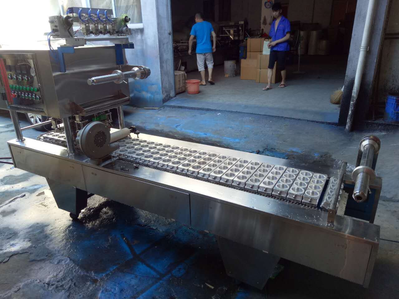 1 .自动送杯;2 .强注灌装(可调最大容量50克,料桶直连);3 .两次热封装置与一次剪切;4. 光标自动修正装置;5.自动收放膜装置;6 .机身采用内用槽钢焊接,外包不锈,与物料接触处用不锈材料 ;7.按样杯制造。