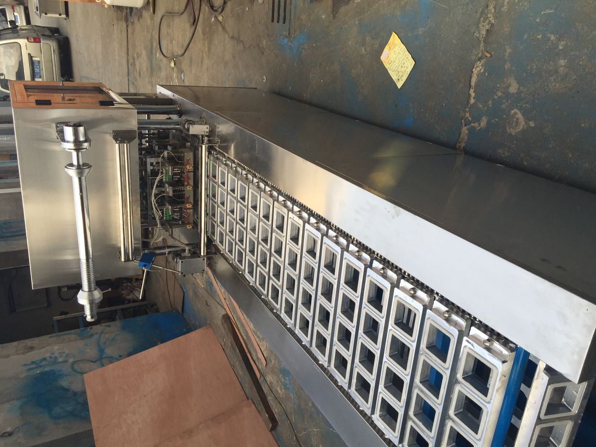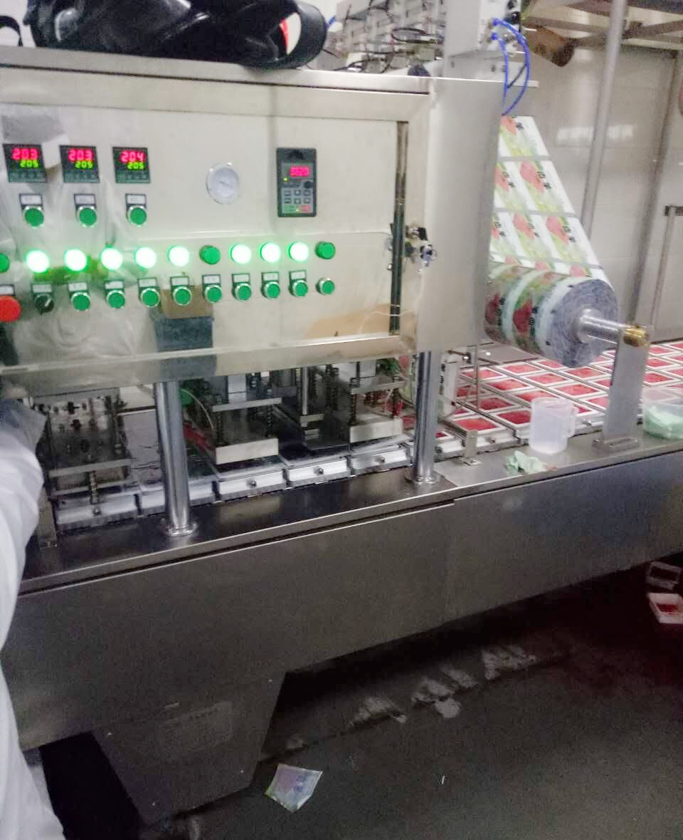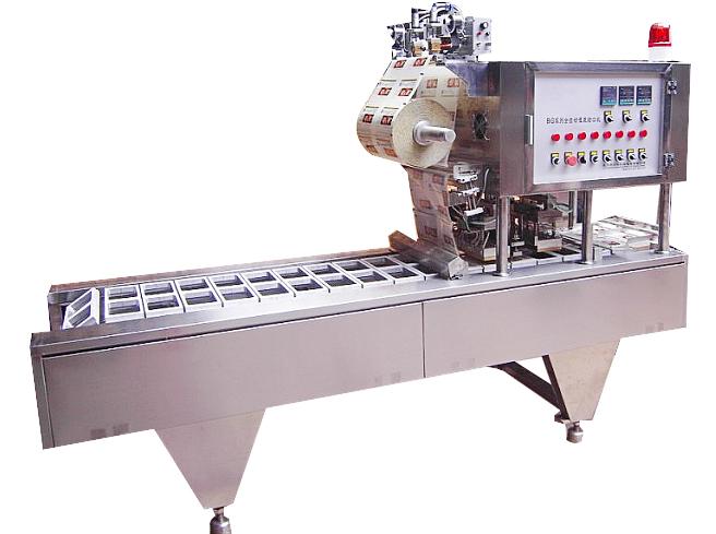 盒装内酯豆腐灌装封口机, 该机采用不锈钢制造,适用于各种形状的塑料盒作容器的液体灌装、封口、切边、自动控温、废料吸卷、日期打印。本厂将根据用户需要设计不同的模具、灌装、封口、剪切等机件满足用户需求。