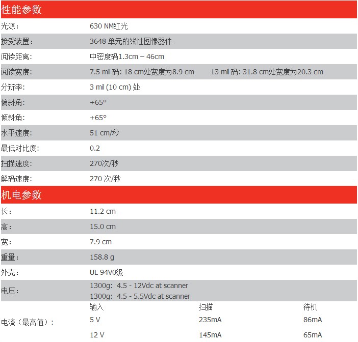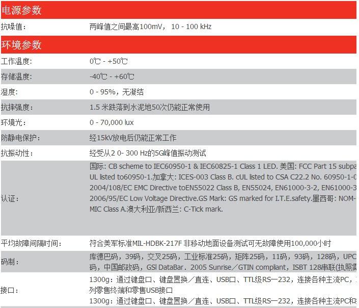 一流的可靠性:霍尼韦尔Hyperion 1300g一维影像条码扫描器无可移动部件,具有带减震功能的橡胶套,可靠的设计能保证持久工作,减少额外的维护费用