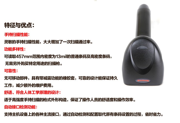 卓越的手持扫描性能: 霍尼韦尔Hyperion 1300g一维影像条码扫描器灵敏的手持扫描性能,大大增加了一次扫描通过率