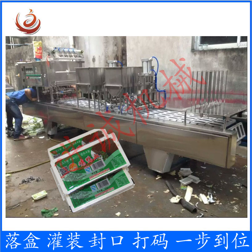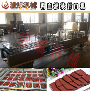 本实用新型公开了一种灌装设备,旨在提供一种鸭血灌装机,其技术方案要点是包括支架,所述支架上设置有用于储存鸭血的第一料筒和用于储存盐水的第二料筒,所述第一料筒和第二料筒底部都设置有通孔和放料机构,所述通孔通过一导管与放料机构连接,所述放料机构下方设置用于放置灌装盒的料板,所述第一料筒和第二料筒下的放料机构都对准同一料板,通过鸭血和盐水同时进入到灌装盒内,使鸭血在灌装盒内凝固成血豆腐,从而实现鸭血灌装过程自动化、机械化,使得鸭血灌装效率提高,更加卫生。