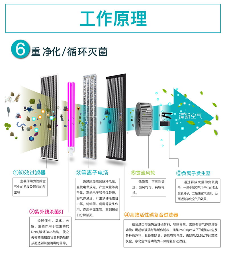◆消毒因子:1、等离子,2、无臭氧紫外灯,3、光触媒催化滤网,4、溶菌酶高效过滤器