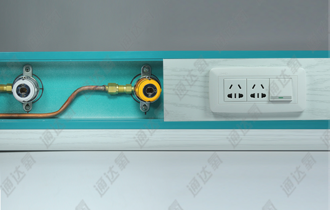 通达氧设备带参照HTM2022标准,采用了电气分离及强弱电分离的设计的理念。选用组合式进行布置,设备带构造分为三腔,强、弱点电和气体采用分离式。电路使用PVC管与铝合金绝缘体,保证了电路通常及安全。