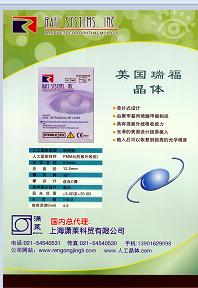 美国瑞福RAFI单片式人工晶体: 单片式设计,产品性能及组成:该产品为一件式,后房人工晶状体,不可折叠,襻形为C型。主体部分及支撑部分由聚甲基丙烯酸甲酯材料制成,添加紫外线吸收剂,具有强紫外线吸收能力,光滑的表面极易植入。屈光度范围:3~35D;光学部分设计:双凸。该产品经环氧乙烷灭菌,一次性使用。