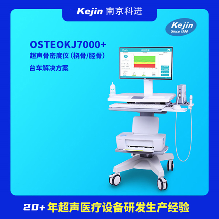OSTEOKJ7000+超声骨密度仪是南京科进实业有限公司推出的检测桡骨或胫骨骨质的超声骨密度仪器,用于测量成人/儿童各年龄段人体骨质状况,该产品的整体解决方案配备便捷台车、24寸液晶电脑一体机、彩色喷墨打印机,使用便捷。