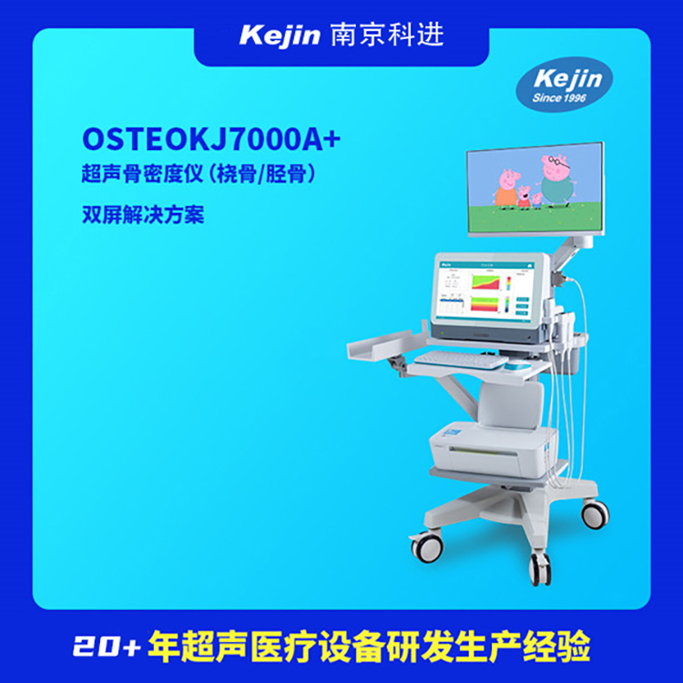 超声骨密度仪OSTEOKJ7000A+是南京科进实业有限公司推出的一款双系统三探头超声骨密度仪,该产品的整体解决方案配备了高清触屏一体机、彩色喷墨打印机、便捷台车及手托、高清显示器可显示拓展内容。